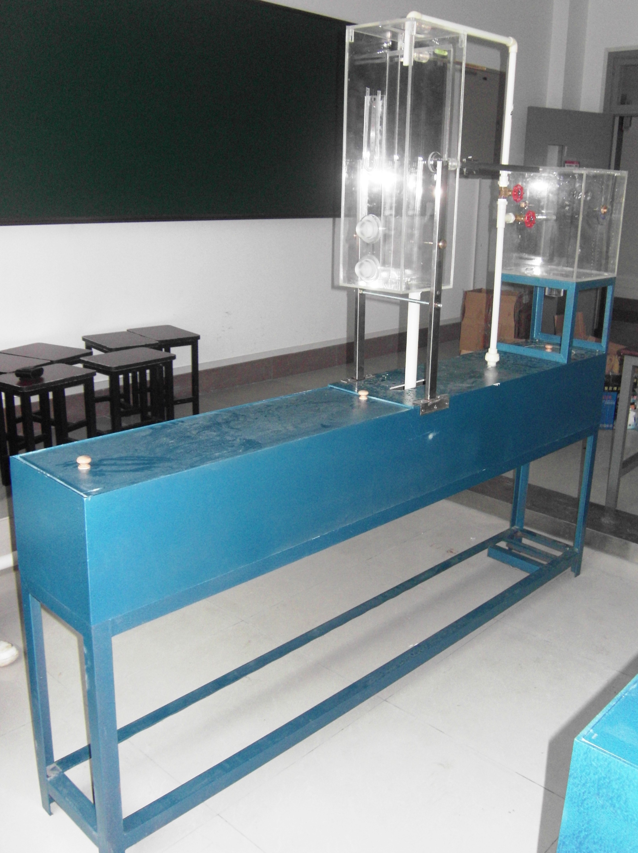 不鏽鋼移動式實(shí)驗台(tái)、有(yǒu)機玻璃整流穩壓水箱、測壓傳感器、溫度傳感器DS18B20、實驗管道及控製閥門、流量傳感器;7寸觸摸屏、水箱;防腐(fǔ)潛水泵等。