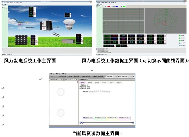 ◆ 顯示內容:蓄電池電壓、風機電(diàn)壓、光伏(fú)電壓、風機電流、光伏電流、風機(jī)功率、光(guāng)伏功率,能量模擬圖,當前風速(米(mǐ)/秒),當前風向(度),當前風力(lì)資源平估。