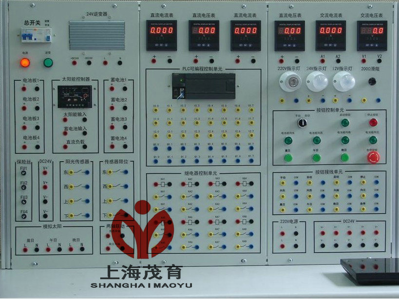 光伏發電控製監控係統由電池板單元、太陽能(néng)控製器單元、蓄(xù)電(diàn)池(chí)單元、保險單元、陽光傳感器、傳感(gǎn)器限位單元、模(mó)擬太陽單元、兩軸聯(lián)動單元、plc控製單元、繼(jì)電器單(dān)元(yuán)、按鈕及按鈕接線單元、和相應的逆變器儀表電源組成。光伏發電控製(zhì)監控係統采用接插線的形式進行接線(xiàn),方便學(xué)生自行設計實訓。