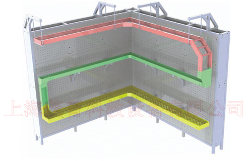 本係統采用仿(fǎng)真管槽安裝環境模型用200x60梯級橋架3米、100x50槽式橋架3米、100x50托盤式3米分上中下三層進行安裝展示,配套有水平彎、三通、異徑接頭、堵頭等配件(jiàn)。