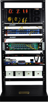 1)裝置選用19英寸開放式落(luò)地型(xíng)機(jī)架,外形尺寸:長0.6米,寬0.53米,高1.8米。機架(jià)下部有4個地腳螺絲固定,保(bǎo)證設備牢固,能夠承受實訓打線衝擊力。