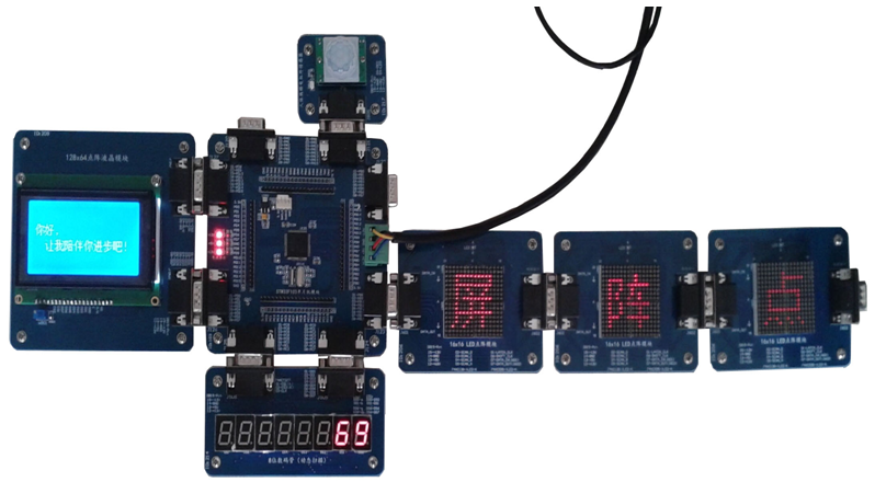 ID101 89C51單片(piàn)機(jī)模塊(主(zhǔ)機),ID209點陣液晶12864模塊,ID207 2.4G無線通信模塊;