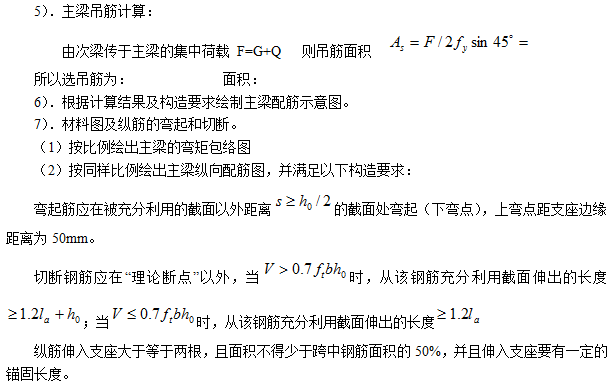 包括荷(hé)載計算,計算簡圖確定,內力計算,繪(huì)製主梁的彎矩包絡圖,正截麵和斜截麵承載力計算,根據主梁的彎矩包絡圖,確定主梁縱向鋼筋的彎起與切斷配筋,繪製主粱配筋圖。